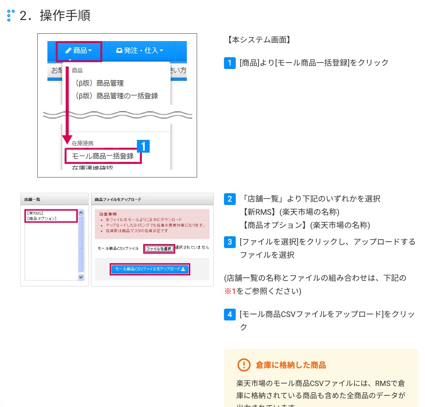 2) モール商品一括登録の機能はメイン機能になりますので、質問はサポートセンターまでお問い合わせくださいませ。